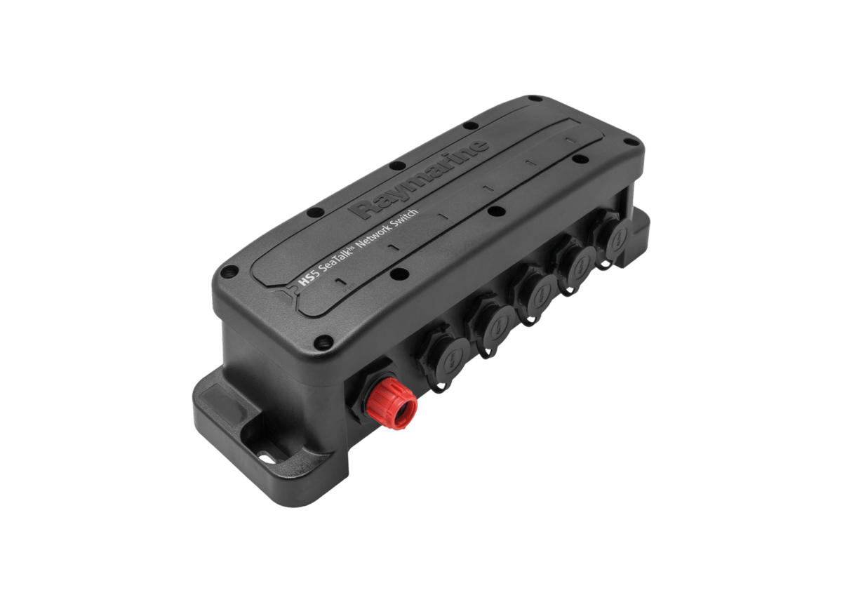5-port RayNet Marine Netværksswitch. Port 1 til 4 er 10/100, og port 5 er Gigabit.